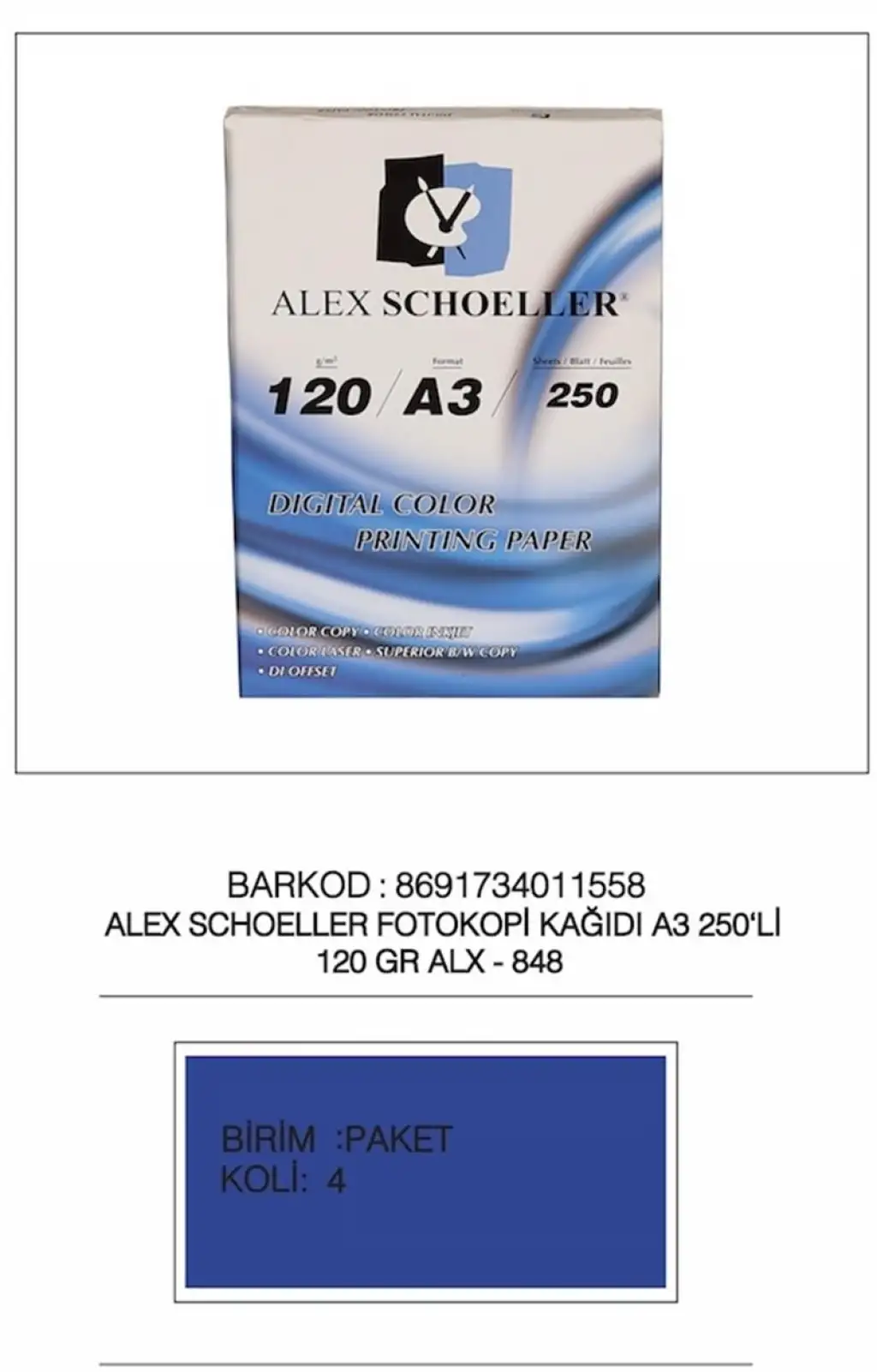 Alex Schoeller A3 Fotokopi Kağıdı Laser-Copy-Inkjet 250 Li 120 Gr Beyaz